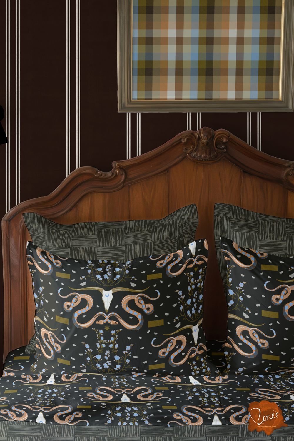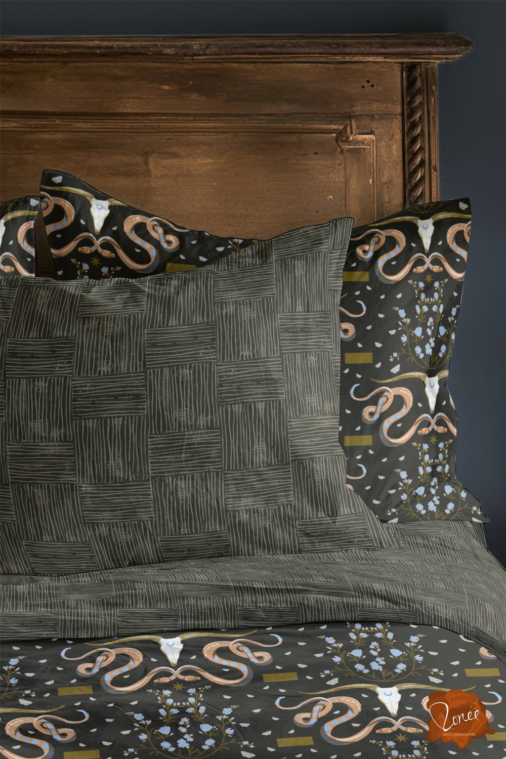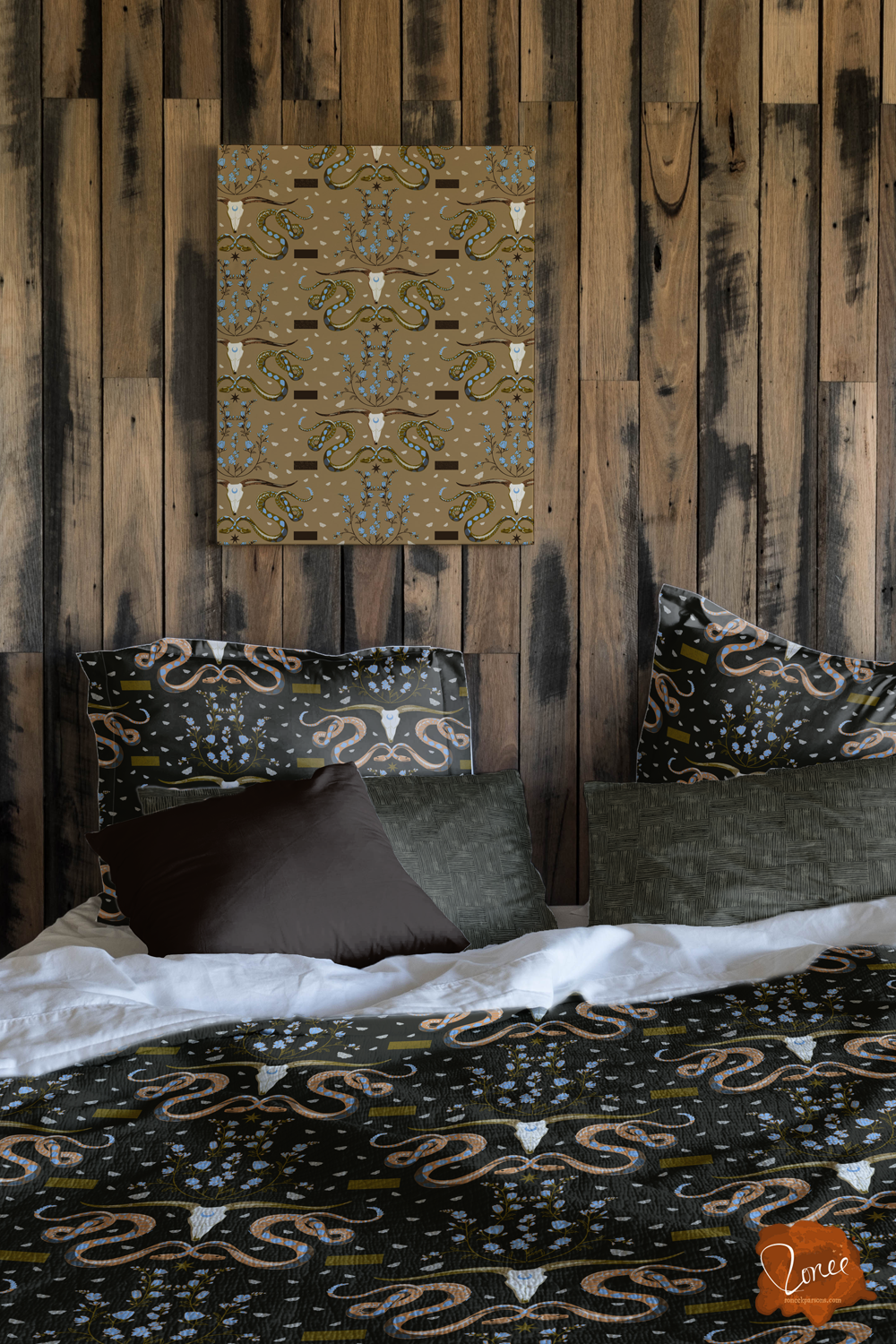 Western inspired motifs in blue and tan are mixed with a selection of neutrals in this gothic western home decor collection. The collection includes longhorn skulls, snakes, and dessert flowers with plaids and carefully selected solids.